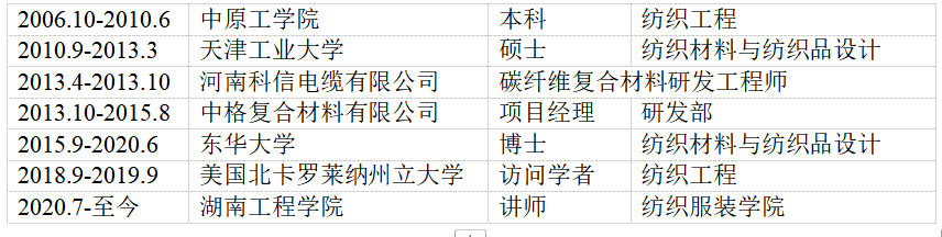 解开放,男,汉族,1988年5月生,河南周口人,博士,无党派人士,纺织工程重点学科学术骨干,2022年度湖南省青年骨干教师培养对象。主要从事纤维材料、产业用纺织品和复合材料等方向的研究,在纺织材料、结构、性能、涂层、改性和制备工艺等方面具有丰富的专业知识背景和实践经验。近五年主持3项省级项目和10项横向项目,参与数十项纵向与横向项目,共发表学术论文30余篇,其中SCI/EI收录20篇,授权专利8项,其中发明专利3项。指导学生获国家级大学生创新创业训练项目1项、校级大学生创新创业训练项目3项,纺织类专业竞赛获奖10余项。