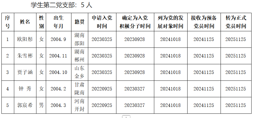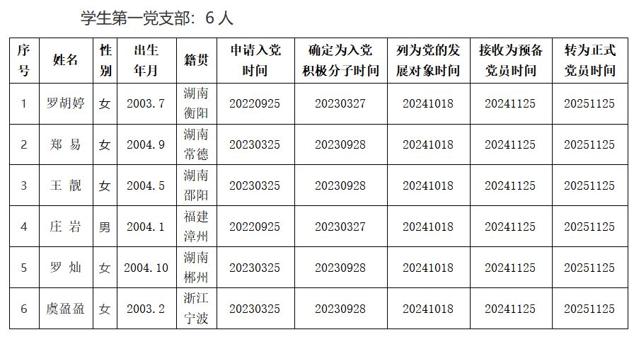 根据《中国共产党章程》《中国共产党发展党员工作细则》及《中共湖南工程学院委员会发展党员工作实施细则》的规定,经本人申请、党支部征求意见、支部委员会审查、学院党委审查和党支部大会讨论决议,决定罗胡婷等11名同志转为正式党员。现将有关情况公示如下: