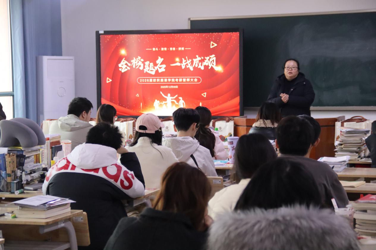 2025年12月9日下午,纺织服装学院纺织楼A201教室洋溢着温馨而昂扬的气氛。在全国硕士研究生招生考试临近之际,学院党总支副书记赵玲令、辅导员袁微微与备战考研的同学们相聚一堂,开展了一场简朴而真挚的动员交流活动,为同学们冲刺阶段的复习注入信心与力量。