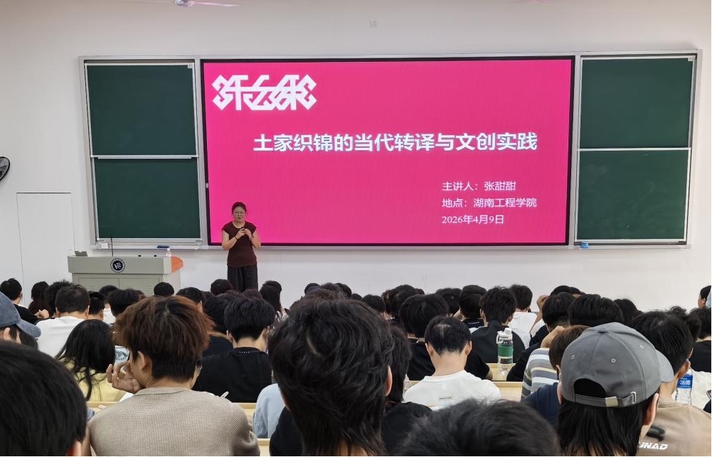 为深化校企协同育人,激发学生创新创业活力,2026年4月9日下午,纺织服装学院在电教楼105室举办“卓越大讲堂之企业家进校园”活动。活动特邀张家界乖幺妹土家织锦开发有限公司总经理、市级非物质文化遗产代表性传承人张甜甜女士,为学院200余名学生带来一场题为“土家织锦的当代转译与文创实践”的精彩讲座。